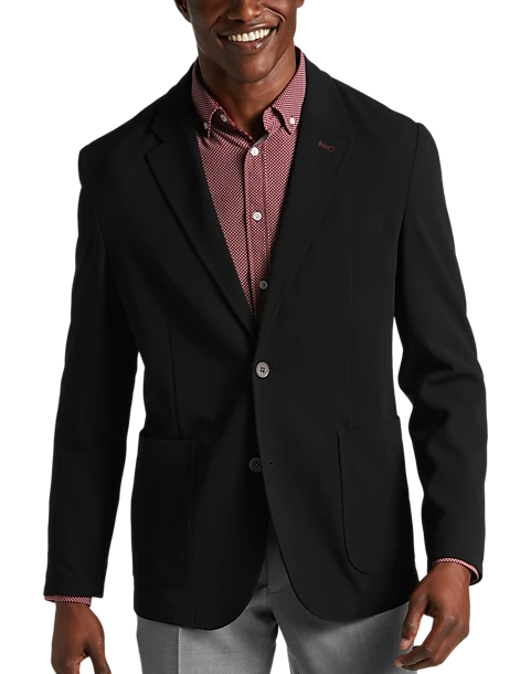 - 98% polyester 2% spandex|Notch lapel|Two-button closure|Patch pockets|Polyester blend crepe knit|Modern Fit|Michael Strahan|